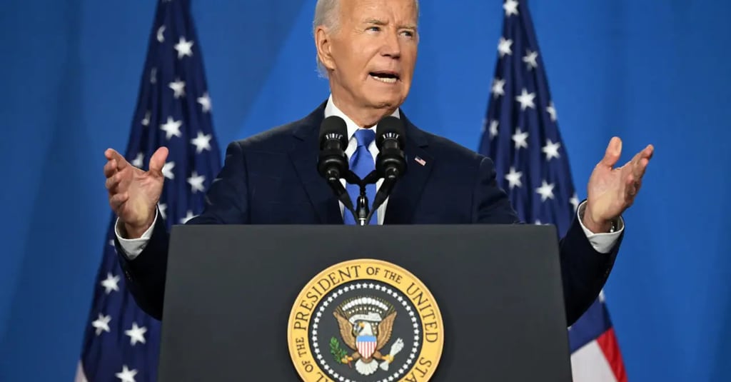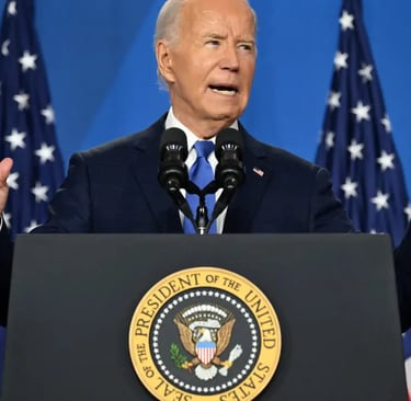 Na imagem o presidente dos Estados Unidos, Joe Biden, em coletiva de imprensa de encerramento da cúpula da Otan (Saul Loeb/AFP). Artigo originalmente publicado em Revista Veja, no dia 16/09/24 ver mais em: https://veja.abril.com.br/coluna/matheus-leitao/por-que-a-desistencia-de-biden-nao-significa-que-tudo-mudara